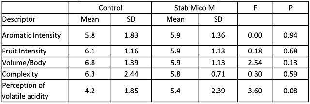 In a triangle test, 8 out of 20 respondents were able to distinguish which wine was different, indicating the wines were not significantly different (Z= 0.40, p= 0.35). There were no significant differences in scores for aromatic intensity, fruit intensity, volume/body, complexity or perception of volatile acidity (Table 5). Though differences in volatile acidity were not perceptible at this time, these wines will age for another year, during which time differences in acetic acid may become more apparent.