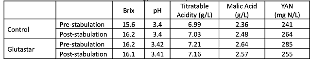 Fruit was whole cluster pressed to a single tank, then split into two equal tanks (750 gallons/2838 Liters each). One tank (treatment) received 30 g/hL Glutastar (851 g rehydrated in 8.5 liters of water). The other tank (control) did not receive this addition. Both tanks were stabulated for 7 days. On the eighth day of stabulation, 30 g/hL bentonite (851 g) was added to settle stabulation lees. The next day, 120 gallons of stabulated juice was racked to puncheons. The remaining juice was racked and returned to tank. The following day, juice was chaptalized with 25 g/L sugar to bring juice to 19.0 Brix. Both treatments were inoculated on 9/10 with 25 g/hL Cross Evolution yeast rehydrated in 30 g/hL Go Ferm. At the end of fermentation, puncheons were used to top fermentation tanks. Both tanks were treated with 30 ppm SO2.