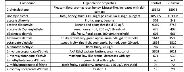 The mechanism of action of Glutastar is to outcompete several aromatic thiols (3MH, 3MHA, 4MMP) for oxidative orthoquinones. White wines contain several phenolics that might be subject to oxidation. Caftaric acid is a hydroxycinnamic acid found in the pulp of grapes that, when oxidized, releases caffeic acid. Grape Reactive Product is also a production of the oxidation of caftaric acid. As wine is oxidized, caftaric acid decreases, caffeic acid and GRP increase. All three of these molecules can be measured with a white wine phenolic panel (Table 4). In this case, there is slightly less caffeic acid in the Glutastar treated wine, however, this same wine has higher levels of Grape Reactive Product, indicating the opposite. Oxidation can also be seen in the absorbance at 420 nm. The Glutastar treated wine does not have lower absorbance than the control wine. In the case of Seyval at Rappahannock, treatment with Glutastar did not produce measurable differences in aroma compounds.
