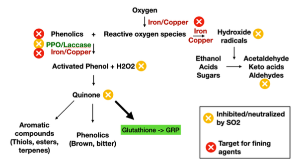 One other aspect of winemaking operations that may drive wine style in Sauvignon Blanc is the inclusion or exclusion of oxygen. When present in wine, oxygen initiates a series of reactions that form compounds that eventually convert thiols, esters, and other odor active compounds into odorless forms (Figure 1). When oxygen first enters the wine, it can form reactive oxygen species through reactions catalyzed by metals such as iron and copper13. These reactive species further interact with phenolics present in the pulp and skins of grapes to form reactive quinones. These reactive quinones can oxidize several other components of the wine including:
