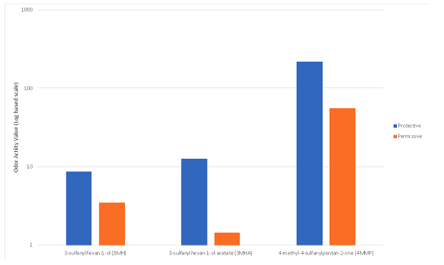 Figure 3: Comparison of thiols found in Sauvignon Blanc treated with permissive vs. protective oxygen strategies (Group ICV labs)