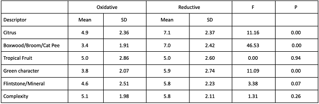 These differences were readily apparent. In a triangle test, 29 out of 29 respondents were able to distinguish which wine was different, indicating the wines were significantly different (Z= 7.42, p= 0). The wine made with protective treatment received significantly higher scores for citrus, boxwood/Broom/Cat Pee, and green character when compared to the wine made with permissive treatment. There were no significant differences in scores for tropical fruit, flintstone/mineral or complexity (Table 5). In this case, different winemaking operations led to two distinct styles of Sauvignon Blanc from the same fruit.