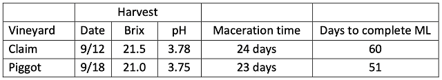 Both lots of Cabernet Sauvignon progressed steadily through fermentation and malolactic conversion (Table 1). The Claim Cabernet Sauvignon finished fermentation with a pH = 3.60 and 13% alcohol while the Piggot Cabernet Sauvignon completed fermentation with a pH = 3.56 and 12.3% alcohol (ICV labs). Both lots received their first SO2 dose on Dec 6.