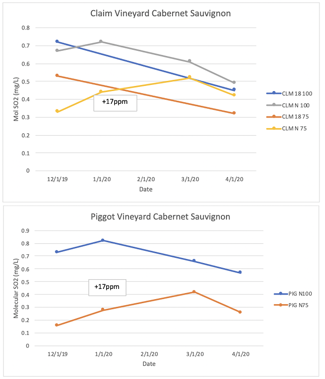 - Barrels treated with 100 mg/L were at or above the target of 0.5 mg/L molecular SO2 for the majority of aging while those initially treated with 75 mg/L were below this level for the majority of aging.