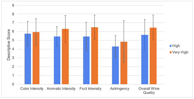 Modified sensory analysis was completed on the wines from the Claim Vineyard aged in neutral barrels. Due to social distancing restrictions at the time of COVID-19, wines were shipped to 27 panelists (all wine producers) in randomly numbered sample bottles. Tasters were presented with three wines, two of one type and one of another, and asked to identify which wine was different (a triangle test). There were three tasting groups with the unique wine in the triangle test balanced between groups. Tasters were then asked to score each wine on a scale of 0 to 10 for color intensity, aromatic intensity, fruit intensity, astringency, and overall wine quality. They were also given open ended questions to describe the wines. Results for the triangle test were analyzed using a one-tailed Z test. Descriptive scores were analyzed using repeated measures ANOVA.