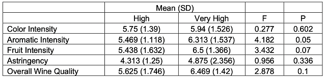 In a triangle test, 16 out of 27 respondents were able to distinguish the wines, indicating the wines were significantly different (Z=2.653, p=0.004). The mean score for aromatic intensity was significantly different for the two treatments, with the higher initial dose scoring higher (Figure 4, Table 5) while scores for fruit intensity and overall wine quality were nearly significantly different.